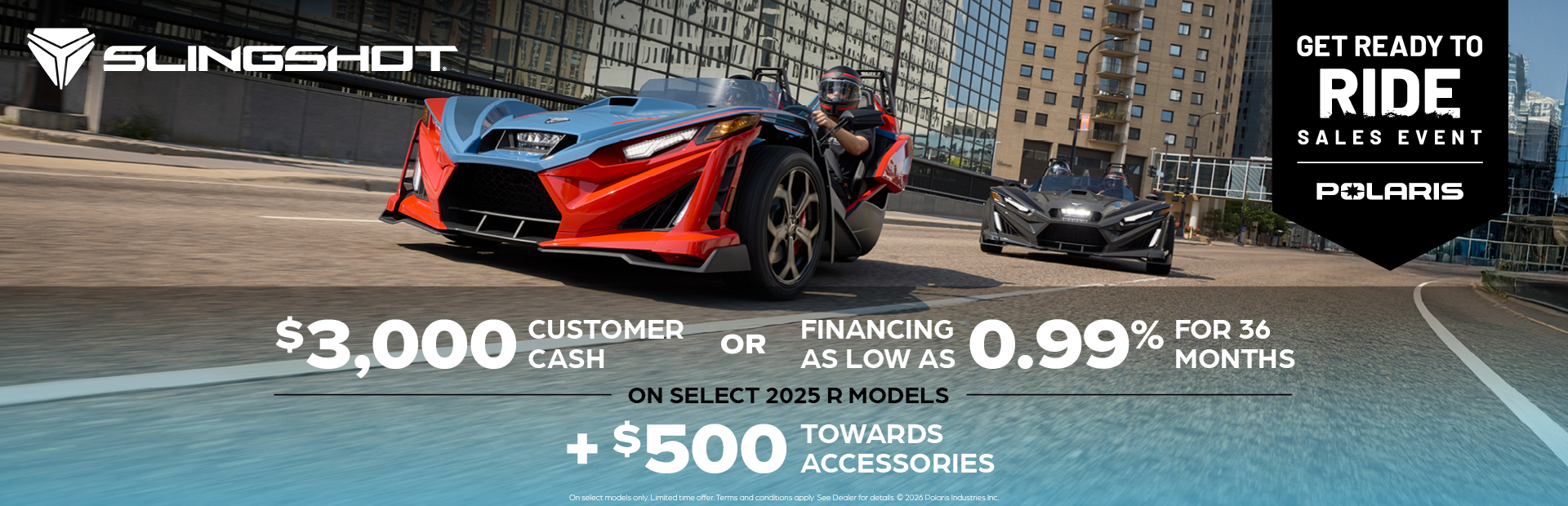 This is a limited time offer which consists of $3,000 Customer Cash rebate towards the purchase of new model year 2025 R Slingshot. This offer is subject to change and may be extended or terminated without further notice. Offer may not be combined with promotional financing on Slingshot R models. All rebates paid to dealer and are not redeemable for cash. The $3,000 customer cash offer is specific to 2025 Slingshot R models. Offer Valid: April 1 – 30, 2026.