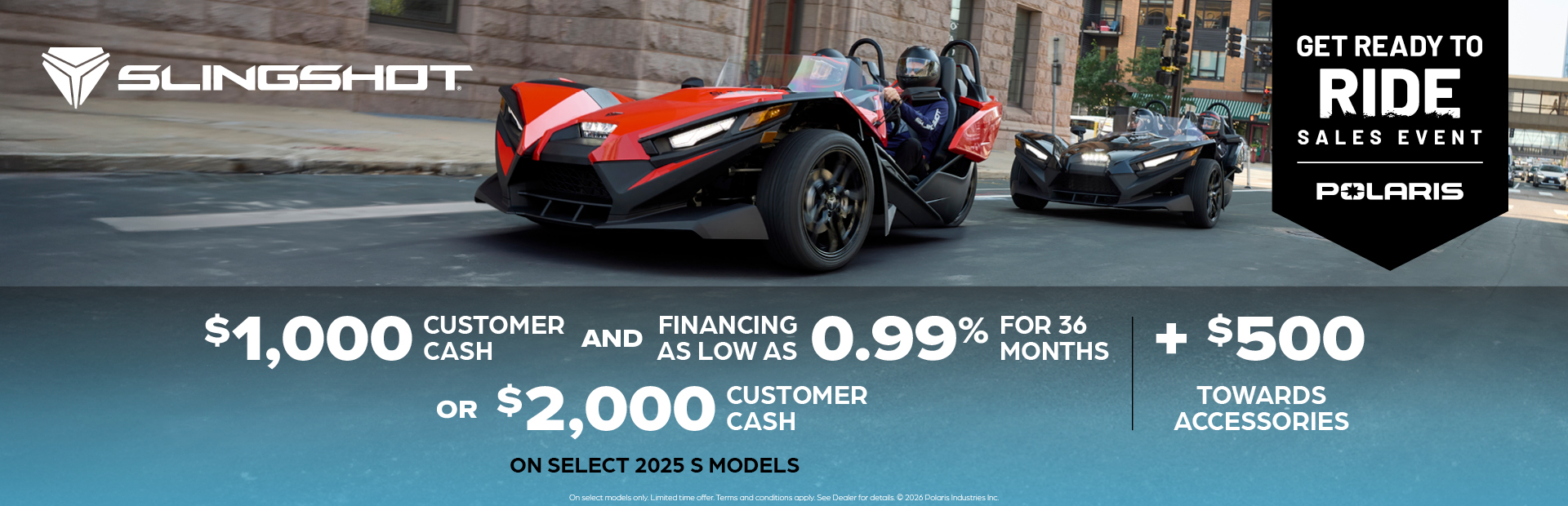 This is a limited time offer which consists of $1,000 Customer Cash rebate towards the purchase of new model year 2026 Slingshot. This offer is subject to change and may be extended or terminated without further notice. Offer may be combined with promotional financing. All rebates paid to dealer and are not redeemable for cash. The $1,000 customer cash offer is specific to the 2025 Slingshot S model. Offer Valid: April 1 – 30, 2026.