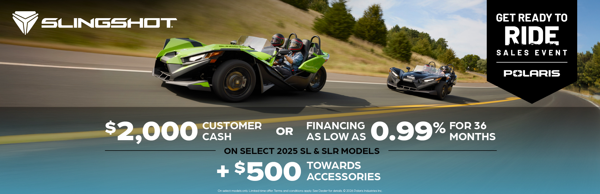 This is a limited time offer which consists of $2,000 Customer Cash rebate towards the purchase of new model year 2025 S, SL, and SLR Slingshots. This offer is subject to change and may be extended or terminated without further notice. Offer may not be combined with promotional financing on Slingshot S, SL or SLR models. All rebates paid to dealer and are not redeemable for cash. The $2,000 customer cash offer is specific to 2025 Slingshot S, SL, or SLR models. Offer Valid: April 1 – 30, 2026.