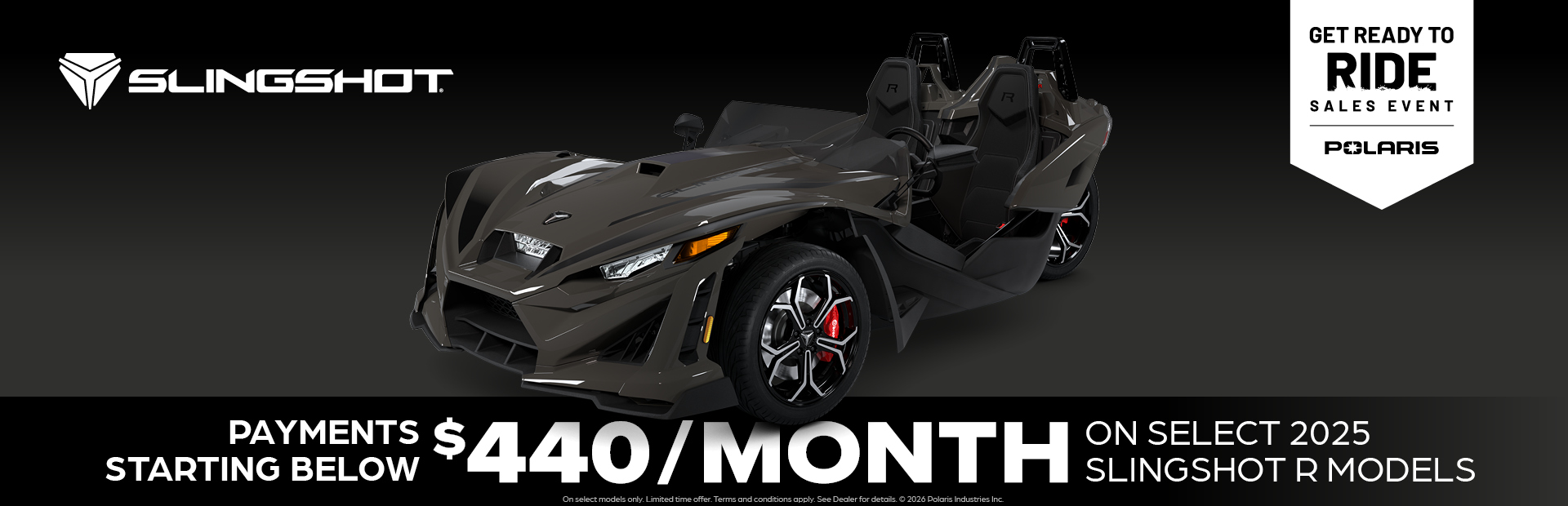 This is a limited time offer which is valid for the purchase of selected qualifying models and is subject to credit approval on qualified purchases financed during this program. Offer may not be combined with certain other offers, is subject to change and may be extended or terminated without further notice. Offer valid on new 2025 Slingshot® models (excluding Slingshot 10). Monthly payment and cost of borrowing will vary depending on amount borrowed and down payment/trade. Minimum amount to finance is $5,000. Example: $28,299 financed at 0.99% APR over 36 months = 36 monthly payments of $718; financed amount of $25,469 with $2,830 down payment, total cost of borrowing of $390 and a total obligation of $25,860. An example of monthly payments required on a 36-month term at 0.99% APR is $28.20 per $1,000 financed. Monthly payment examples assume 10% down and do not include taxes, title, and other fees. Offer only valid to qualified customers, not all customers will qualify, other offers available, see dealer for details. Offer Valid: April 1 – 30, 2026.